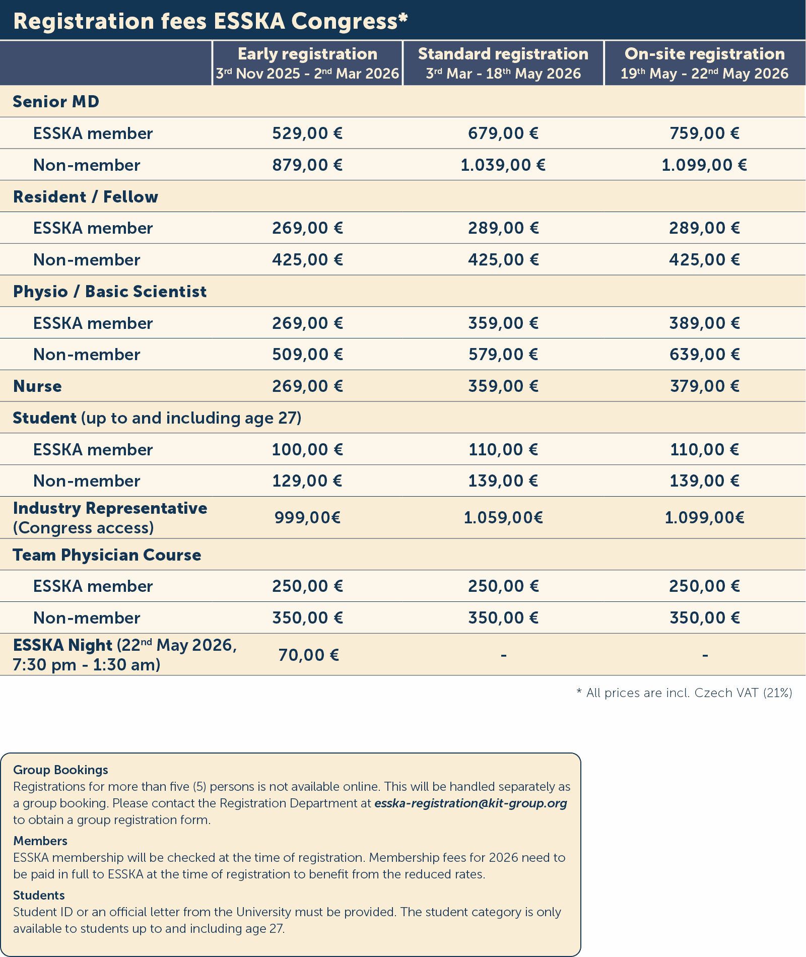 ESSKA membership will be checked at the time of registration. Membership fees for 2026 need to be paid in full to ESSKA at the time of registration to benefit from the reduced rates.